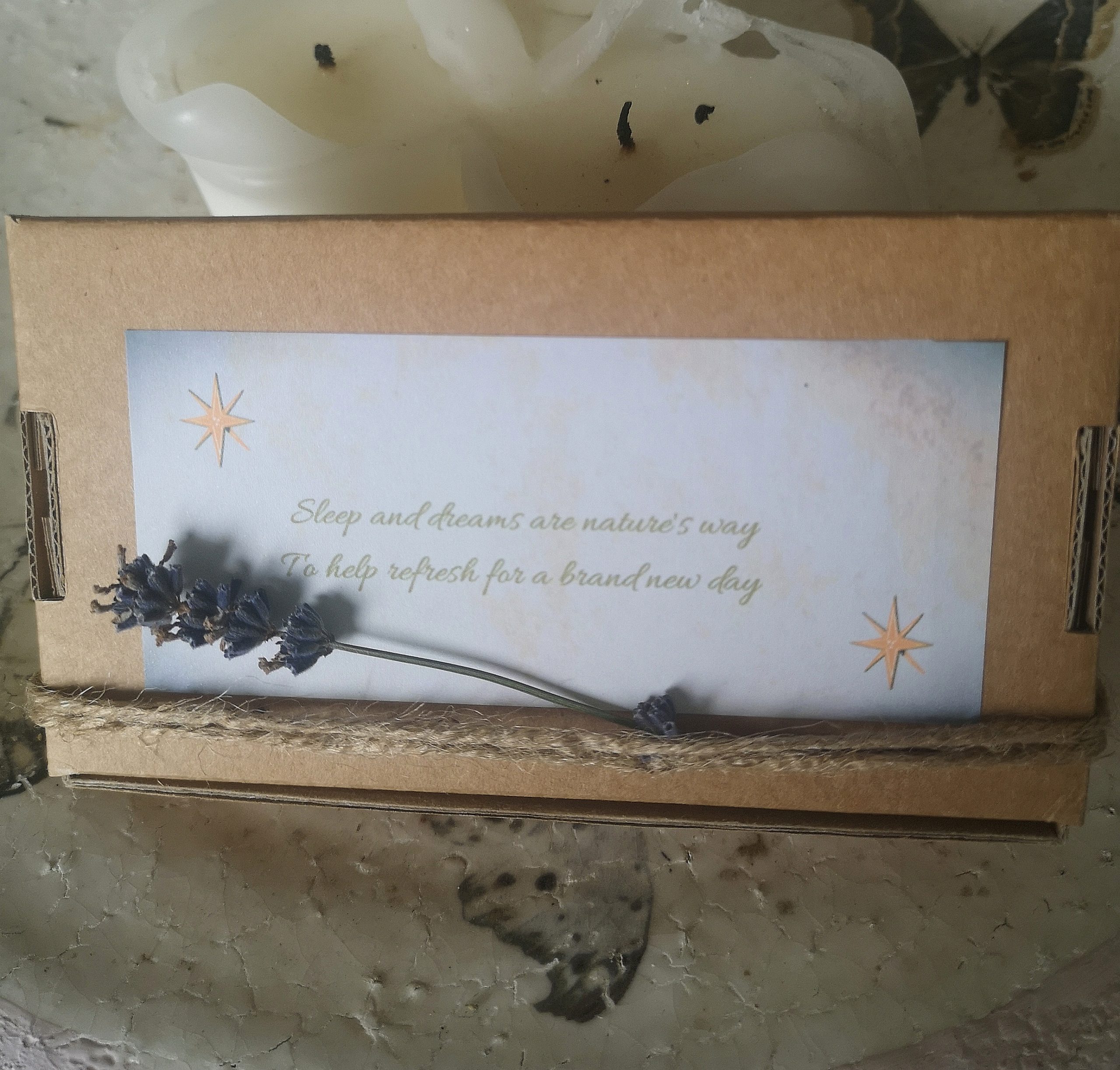 This little box contains a beautiful handmade pillowspray and a peach sateen eye mask to help enhance sleep
