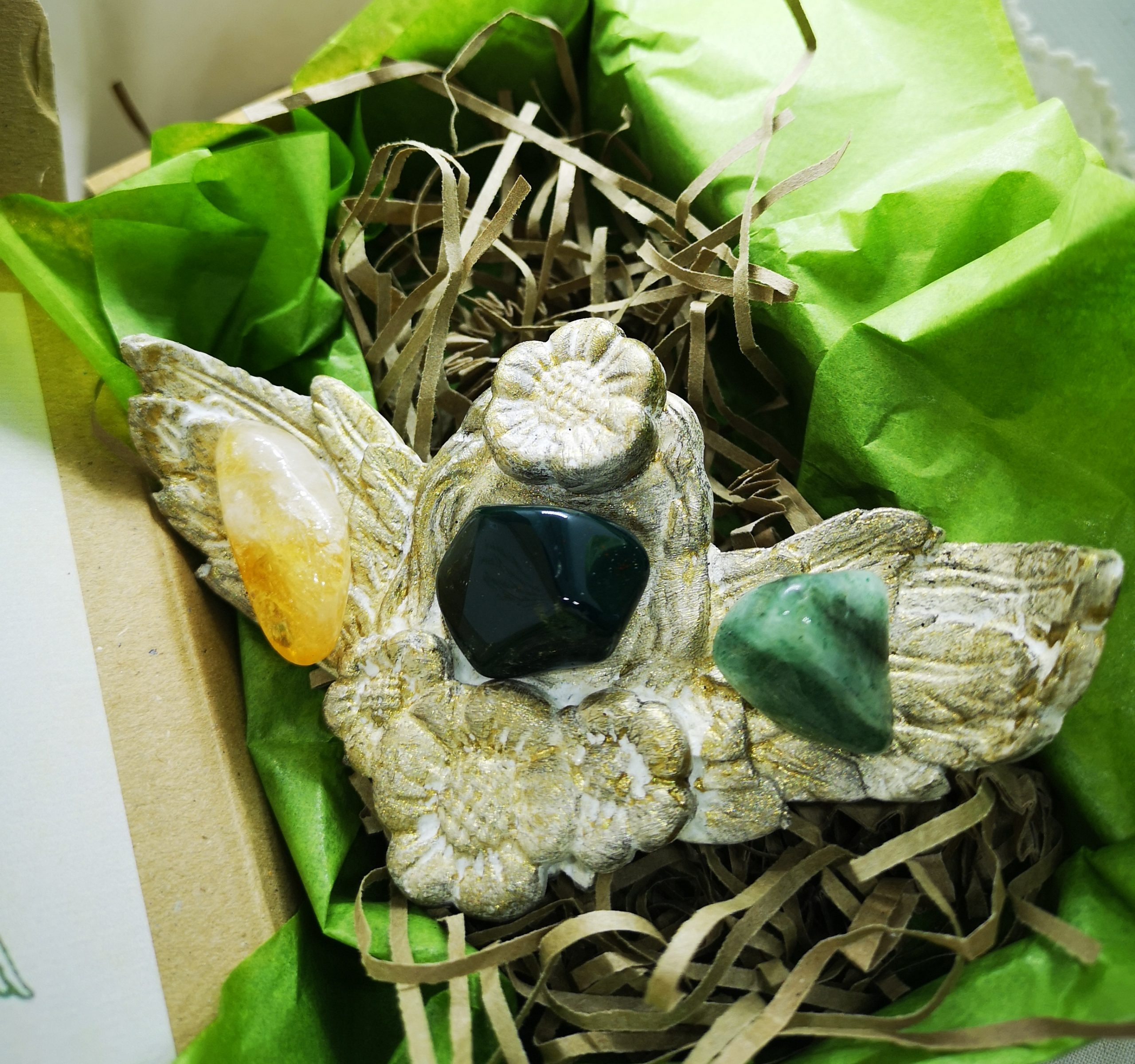 Your crystals are designed for Health Wealth and Happiness . These small tumblestone crystals that are included in the set can be carried with you in times of need or kept on the little Angel Wings trinket tray.